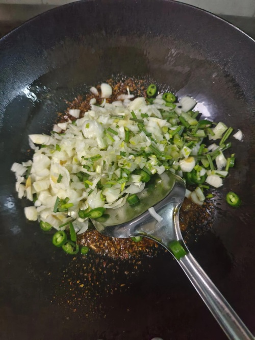 小蒜辣椒炒制断生后,加入开水!然后调味放盐、鸡精味精。
