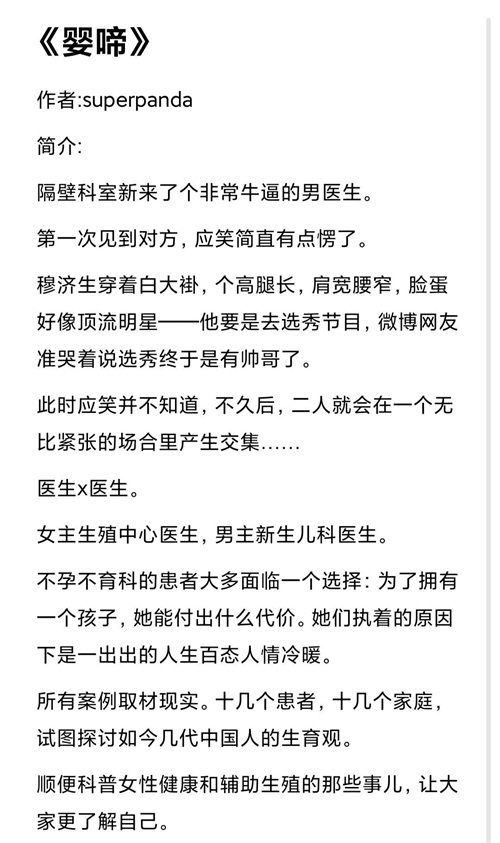 这本是男女主双医生的设定,女主生殖中心医生,男主新生儿科医生