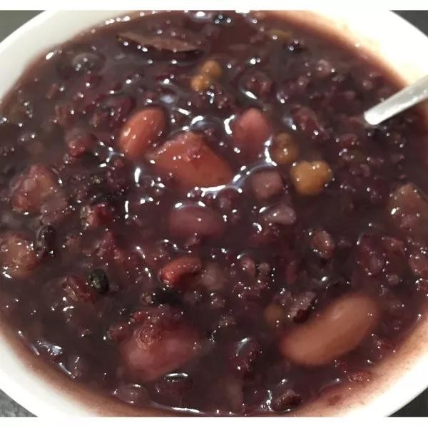 首先将糯米,黑米红豆,薏仁等配料洗干净,并且要浸泡一晚上,第二天早上把泡好的材料倒入熬粥桶中,大火熬开,改小火慢慢熬半小时,加入红糖搅拌均匀了。盖上盖闷5分钟。