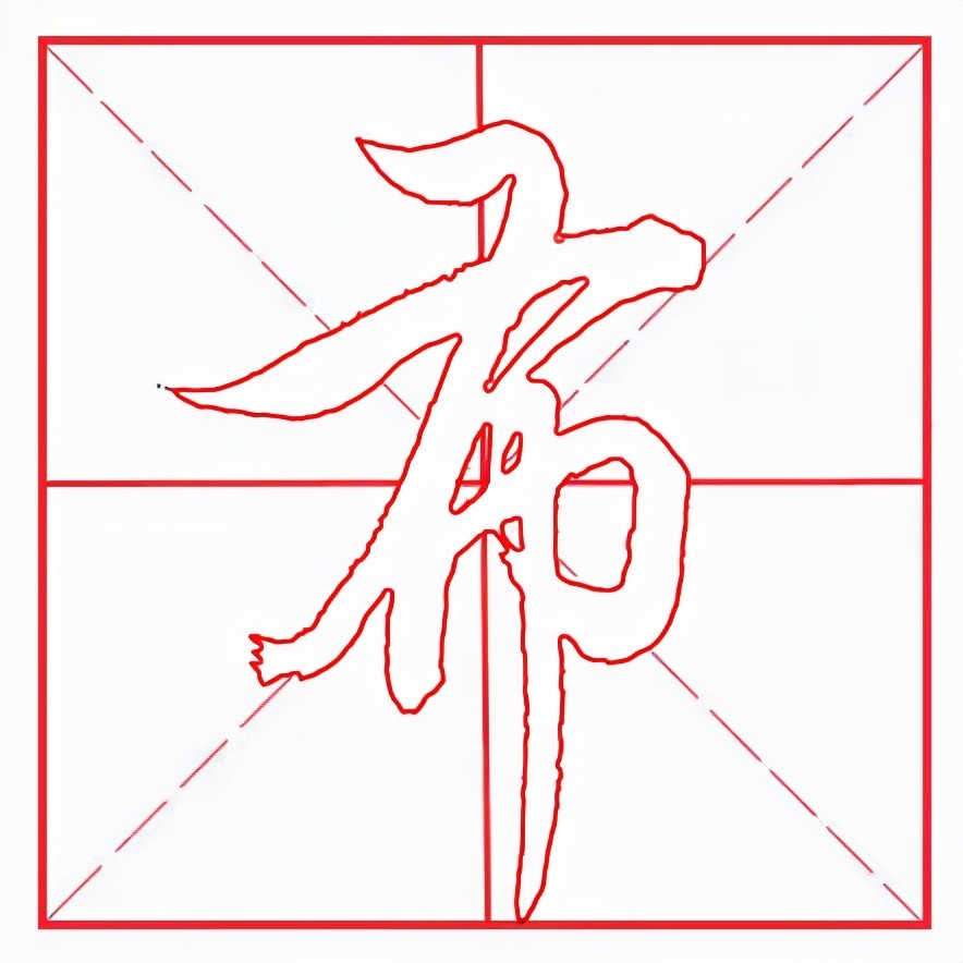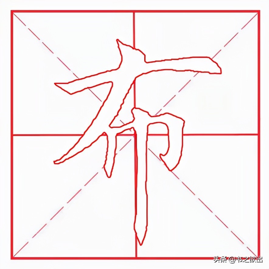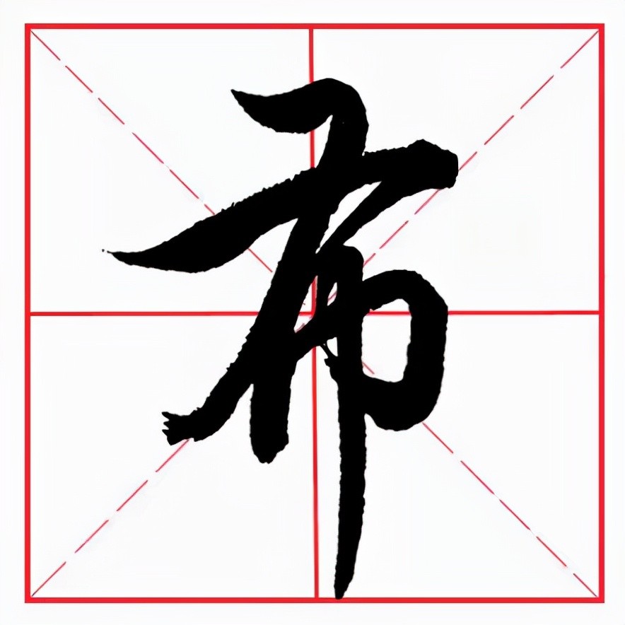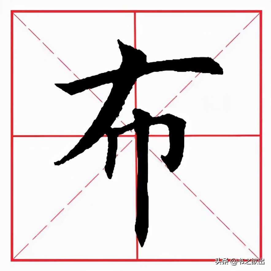 “布”字的笔顺先写撇再写横。撇笔斜切落笔,稍重,然后折锋向左下行,撇身稍直,过撇肚后稍带弯度快速撇出,力达撇尖;横画起笔左探,与撇画的收笔平齐,然后向右稍抗肩上行,中间略轻,右部略平,收笔稍下压,整体勿粗重,略呈拱形。