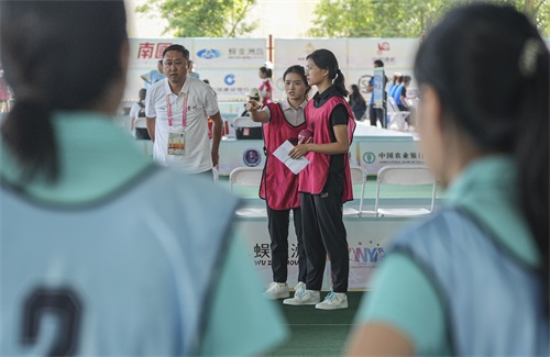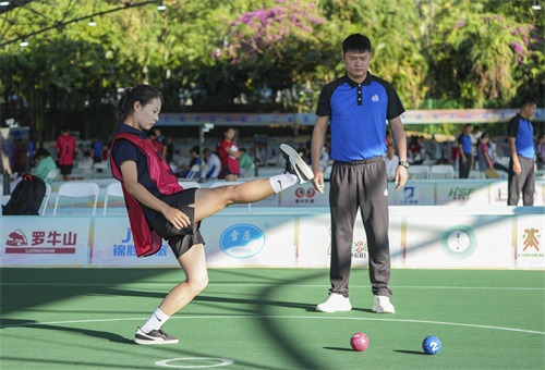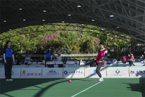 当日,第十二届全国少数民族传统体育运动会蹴球项目女子双蹴小组循环赛在海南三亚学院风雨球场举行。