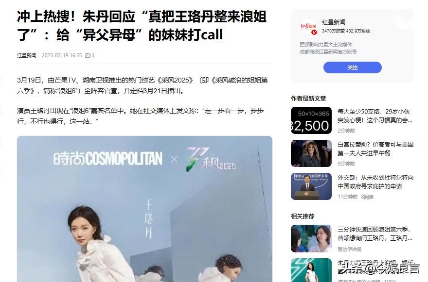 冲上热搜!朱丹回应“真把王珞丹整来浪姐了”:给“异父异母”的妹妹打call.红星新闻.2025-03-19