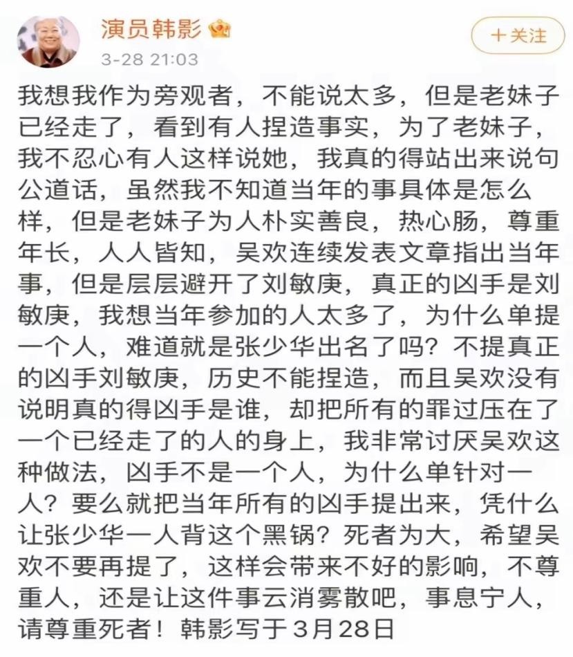 曾经出演过«我爱我家»的演员韩影发布声明,为好友张少华说了公道话,让事情发生了转机。