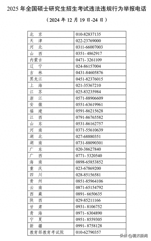 现将2025年全国硕士研究生招生考试违法违规行为举报电话向社会公告,欢迎参与监督,共同营造良好考试环境。