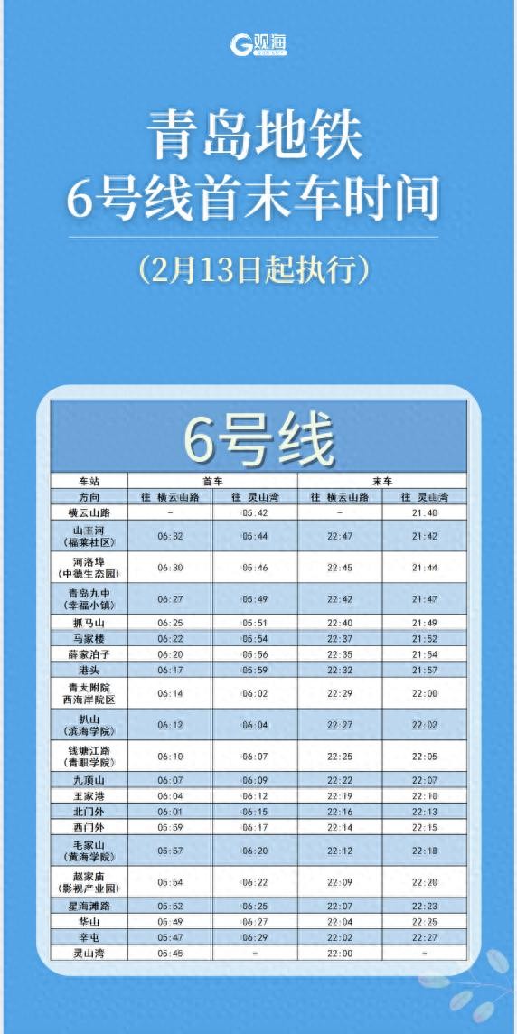 青岛日报社/观海新闻讯 记者获悉,为满足6号线沿线乘客的乘车需求,进一步提升乘客出行便捷性,自2月13日(正月十六)起,青岛地铁6号线首末车时间调整,横云山路站首车时间由06:00提前至05:42,末车时间由21:30延后至21:40,灵山湾站首车时间由06:15提前至05:45,末车时间不做调整。调整后各站首末车时间如下: