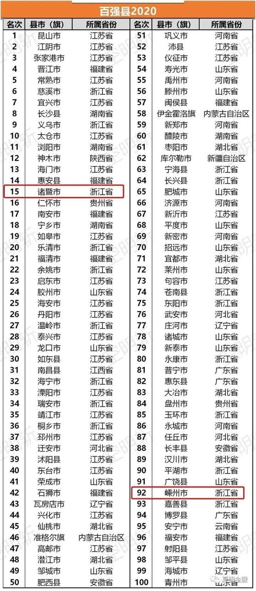 刚刚,2020年全国百强县榜单出炉!绍兴两地诸暨、嵊州上榜,其中诸暨排在第15位!