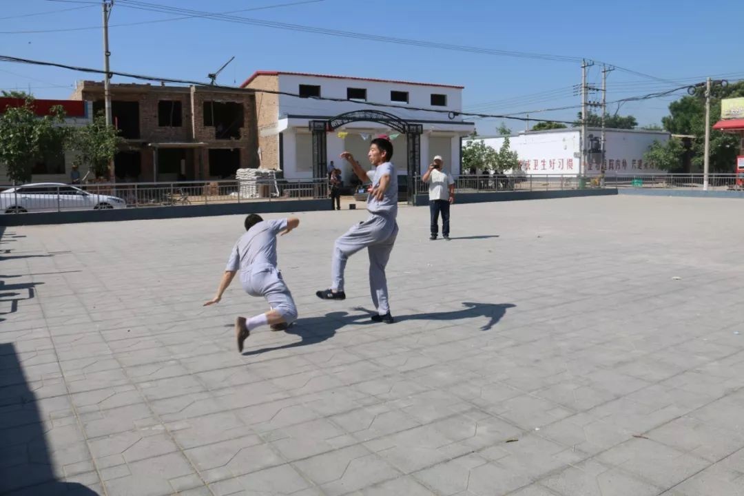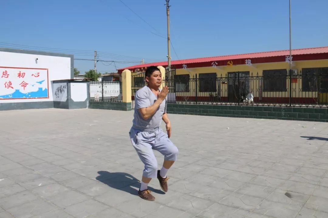 北枣村文化广场上,锣鼓喧天,热闹非凡,一众村民伴随着锣鼓的节奏,演示五虎上将大洪拳。