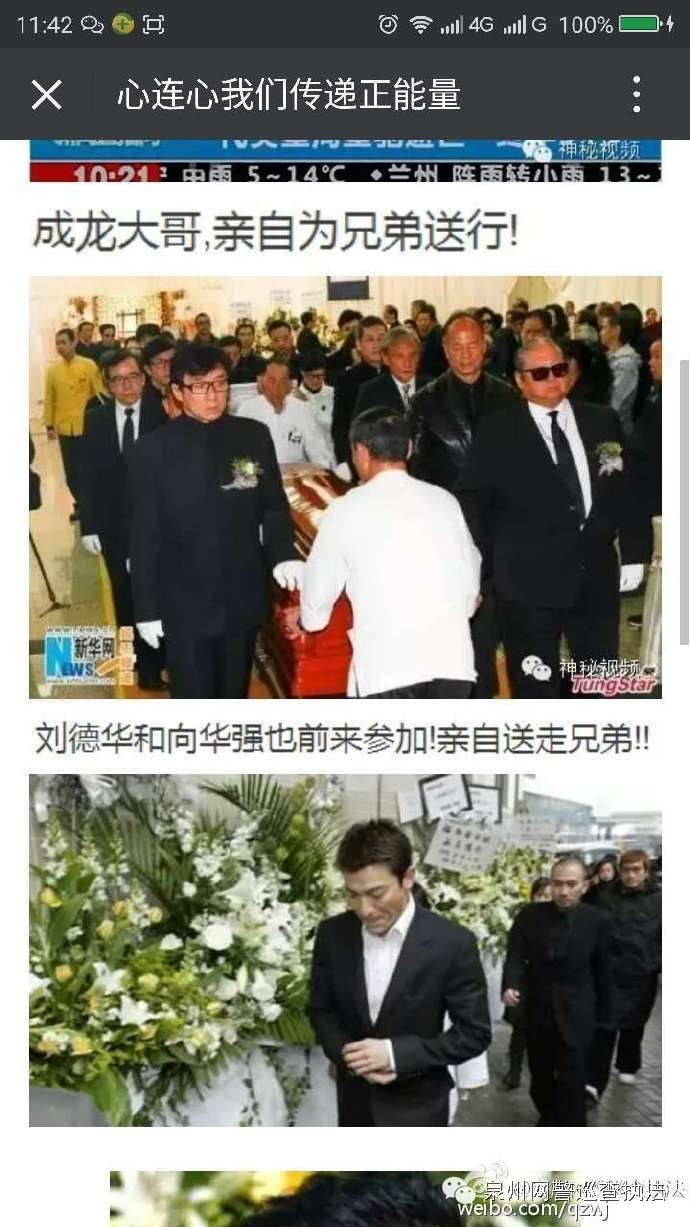 近日,多个微信公众号发布信息称周星驰于2016年5月9日上午在香港因病去世,并附上多张图片,包括成龙、洪金宝、刘德华等明星扶灵送葬的照片。
