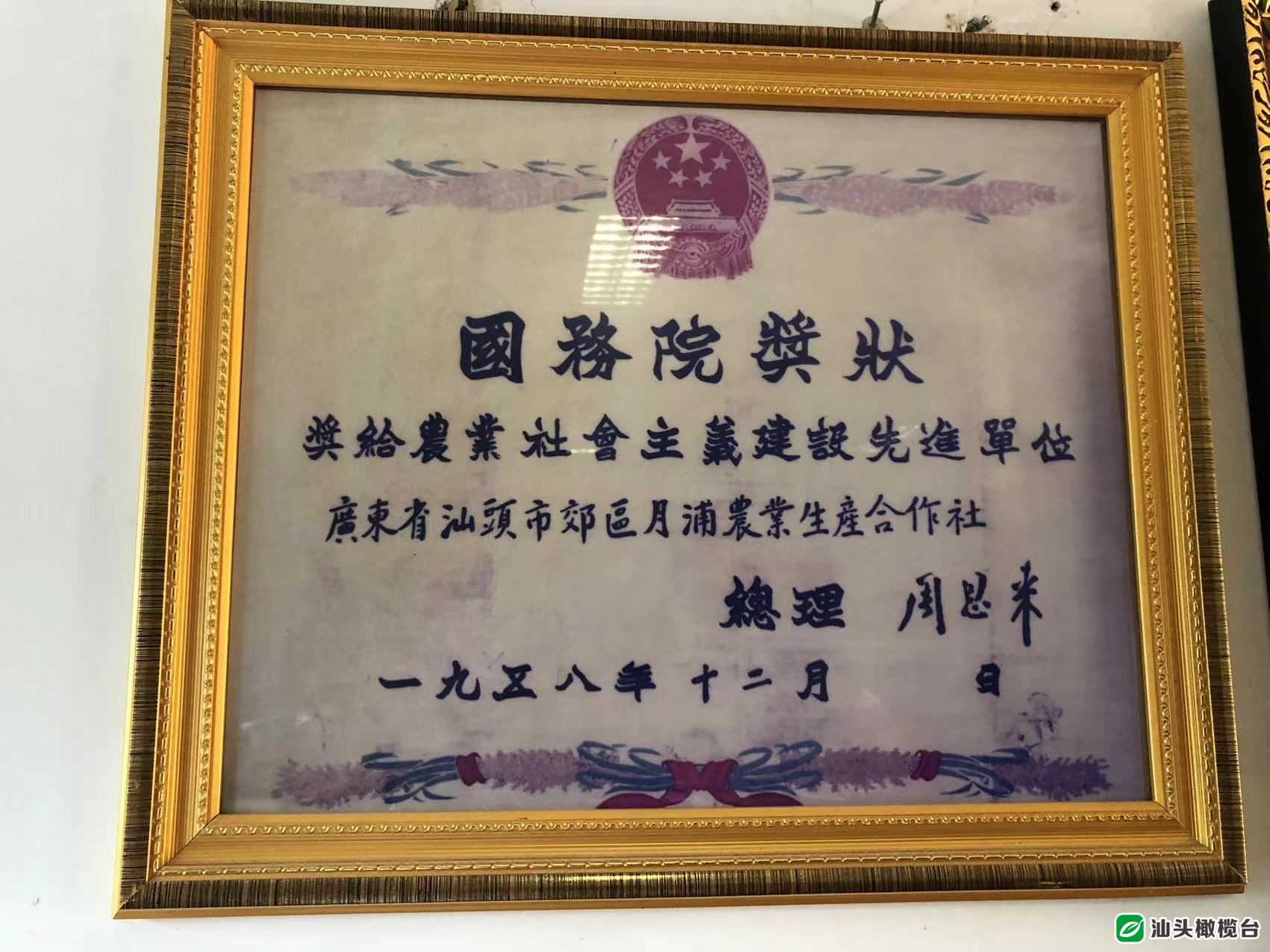 在金平区月浦街道月浦社区党委会办公室,一张发黄褪色的奖状挂在醒目位置,被精心地保管着。这张奖状由国务院颁发,落款为“总理”和手写体“周恩来”,它承载着一段光荣的历史。