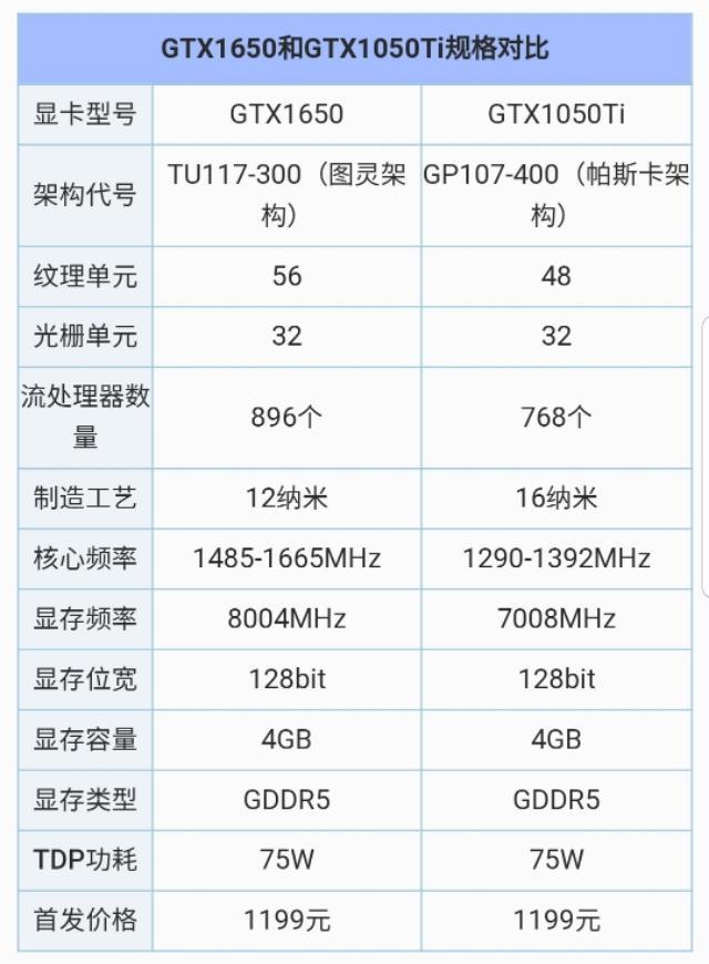 关于GTX1650和GTX1050Ti哪个好的问题,老规矩,我们先来看看GTX1650和GTX1050Ti的规格对比吧,具体对比如下。