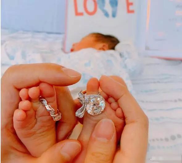 安以轩配上的照片中,宝宝熟睡在襁褓中,样子十分灵巧心爱。宝宝的脚被安以轩夫妇捧在手中,脚上分别戴上了安以轩夫妇成婚时两边佩戴的大钻戒。据悉,宝宝脚上带的安以轩的婚戒有10.57克拉,十分豪气。