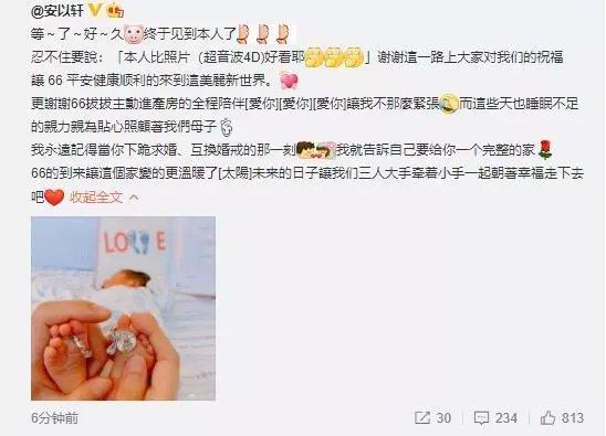 台湾影星安以轩宣布产下儿子:三人大手牵着小手一起幸福走下去