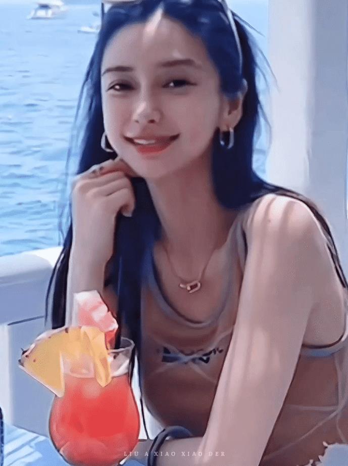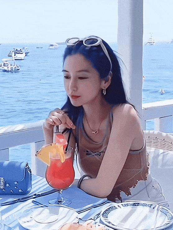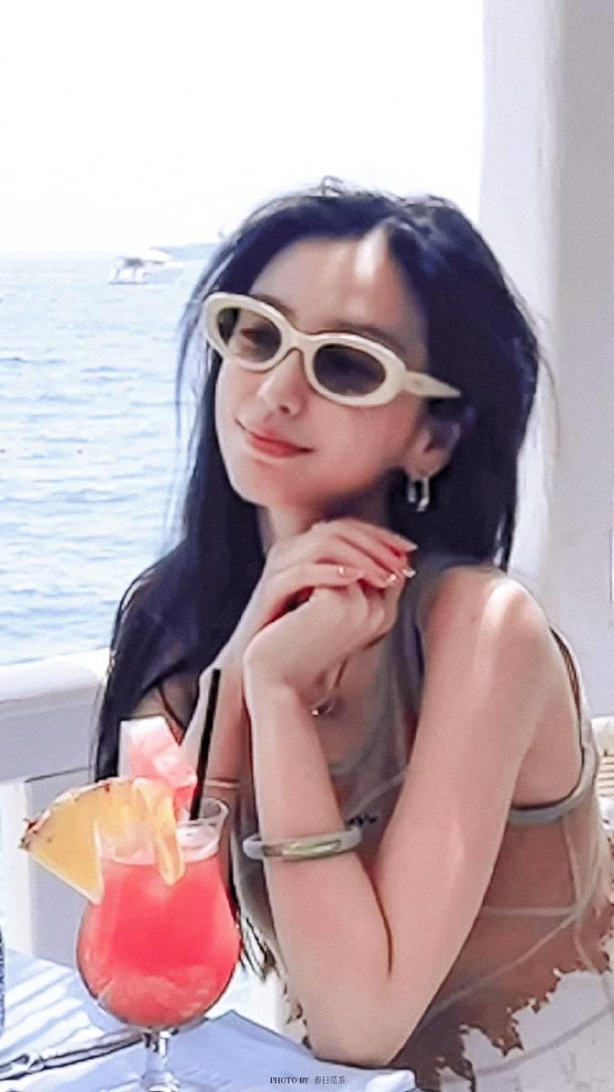 Baby戴着墨镜在船上喝饮品,享受欢乐时光。