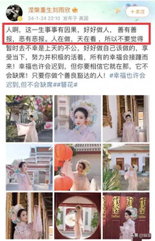 张檬自曝备孕失败后,刘雨欣发文:“人啊,这一生事事有因果,好好做人, 善有善报,恶有恶报,人在做,天在看。” 疑似在暗讽张檬怀不了孕