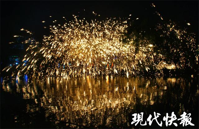 值得一提的是,当晚瘦西湖还上演了一场 " 打铁花 " 视觉盛宴。民间艺人现场表演了传统非物质文化遗产项目——打铁花。非遗艺人将铁水抛起,再用板子奋力一击,耀眼的铁水在空中瞬间绽放开来,灿若星辰。1600 ℃的铁汁被抛向空中,击打成 " 铁树银花 ",为大家带来了一场壮观、震撼的视觉盛宴。