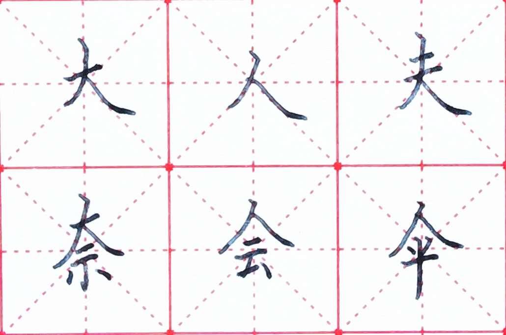 在撇、捺笔划组合中,撇和捺的位置关系需要说明一下:在独体字中,撇脚要高于捺脚;在复合字中,撇脚要低于捺脚。撇要写短,捺要写长。
