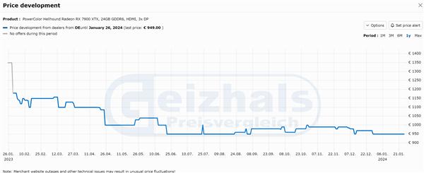 比如在德国大型零售商 MindFactory,撼讯的 RX 7900 XTX 暗黑犬已经杀到了 899 欧元,相比一年前的首发价 1599 欧元已经便宜了接近 45%,几乎腰斩!