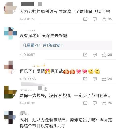对于涂磊突然离开《爱情保卫战》的舞台,很多的网友表示不是适应,因为他们都已经习惯了有涂磊在时的口语犀利,他帮助过很多在爱情里迷失方向的人们,大家都很舍不得他。