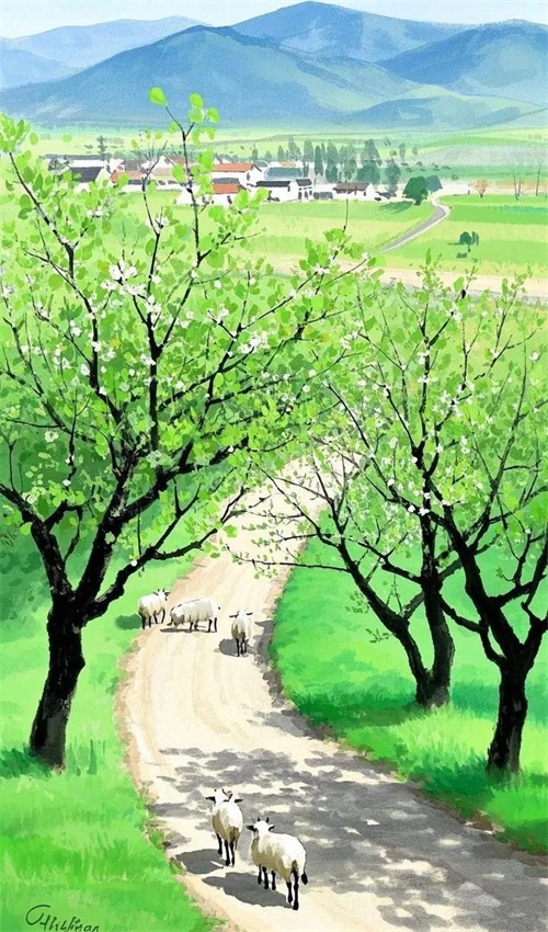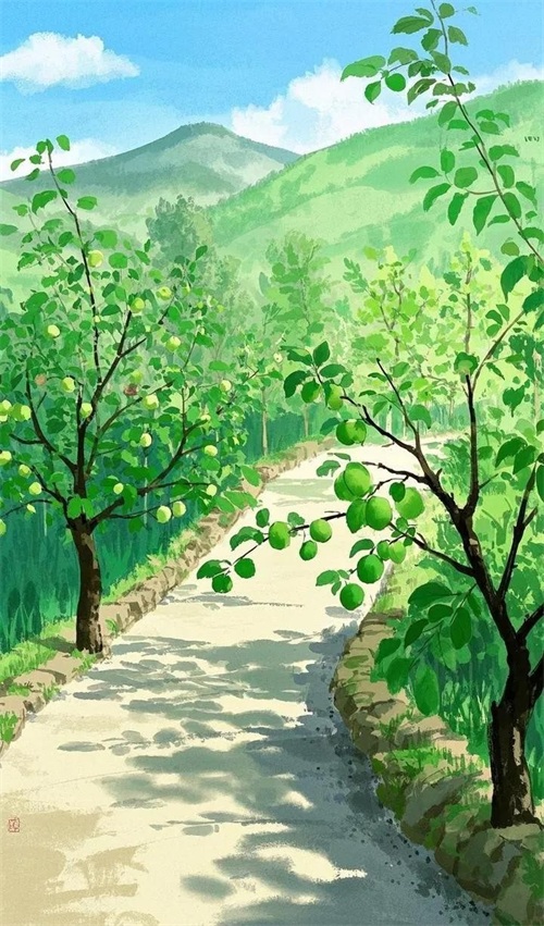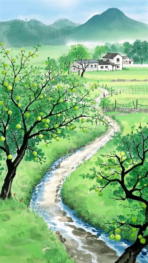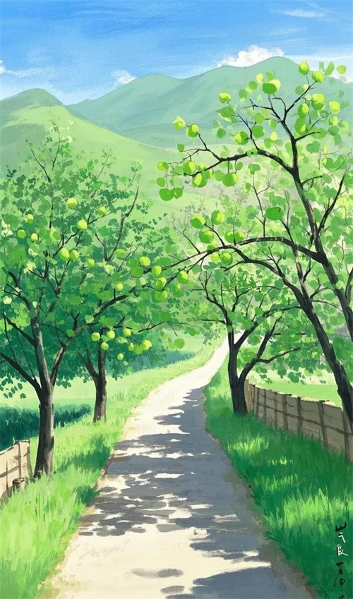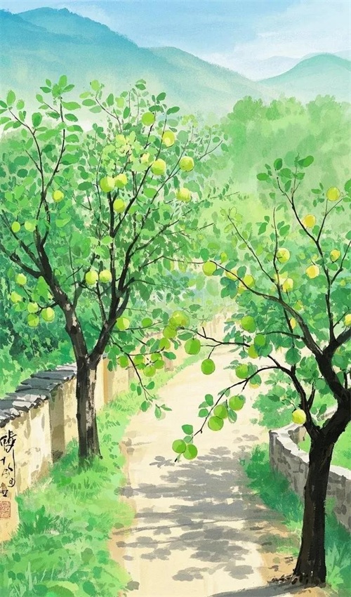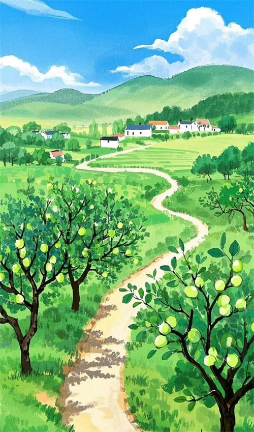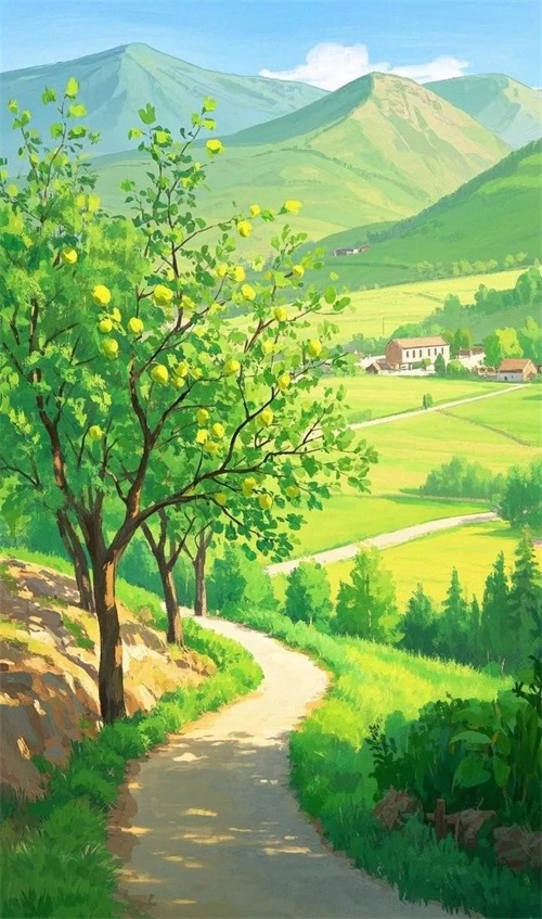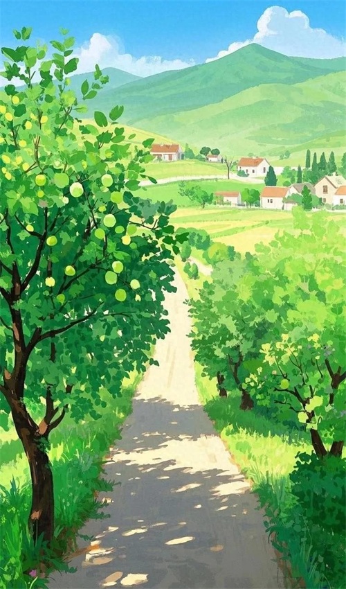 蜿蜒的土路旁,树木郁郁葱葱,枝头挂满了青嫩的果子,仿佛能闻到那淡淡的果香。错落的房屋点缀在绿野之间,满满的生活气息。