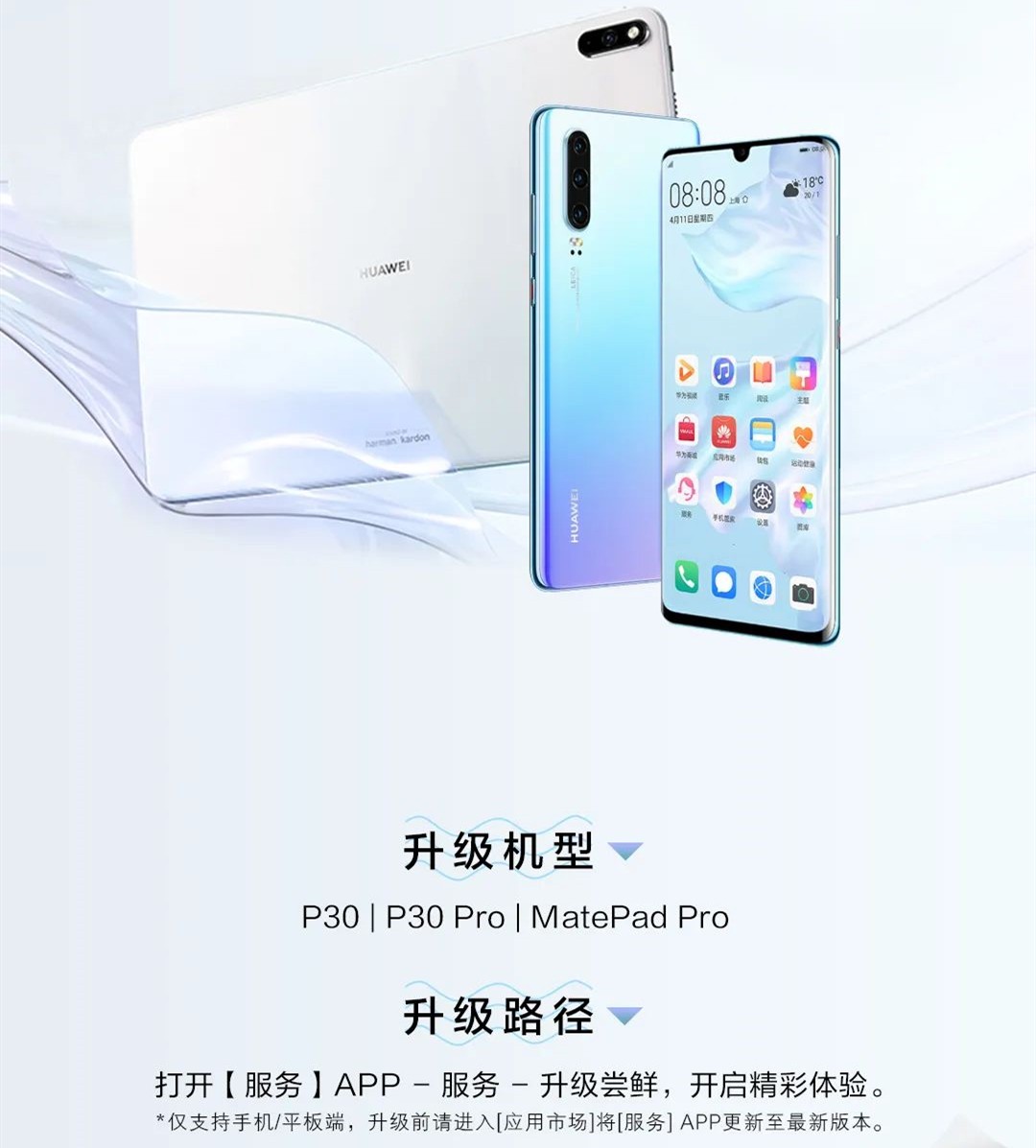 根据华为EMUI官方的介绍,本次EMUI10.1正式版暂时对华为 P30、华为 P30 Pro、华为 Mate Pad Pro平板电脑开放升级,以上3款机型的花粉会陆续收到系统升级推送,还没有收到推送的花粉也可以根据华为MEUI 官方的介绍,进行手动升级。