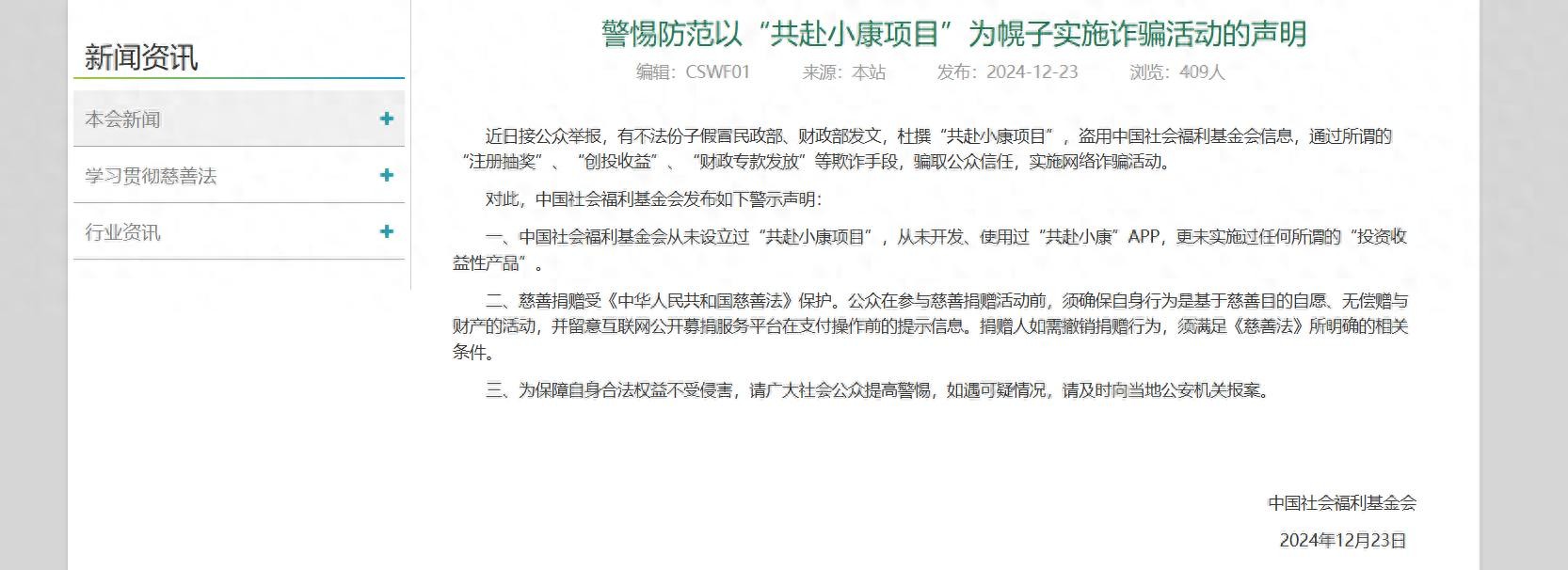 12月24日,中国社会福利基金会在其网站发布警示声明,声明如下: