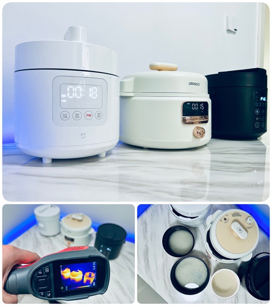 做米饭可以说是每个电压力锅最简单也是最难的考题了,虽然把米饭做熟没有难度,但想把米饭做得Q弹软糯,就离不开火候的精准把控了。首先在三款电压力锅倒入相同容量的水和大米,然后观察整个过程并进行热成像测试。