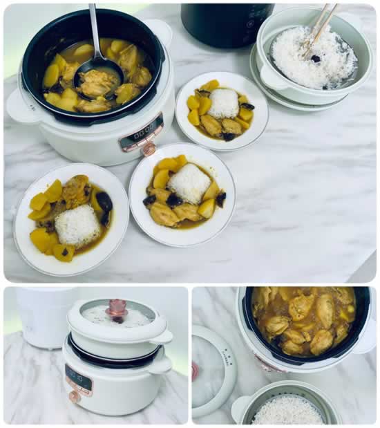 七彩叮当电压力锅“上蒸下煮”的蒸锅模式,下面的锅在煮咖喱鸡肉的同时,上面的蒸笼还能蒸米饭
