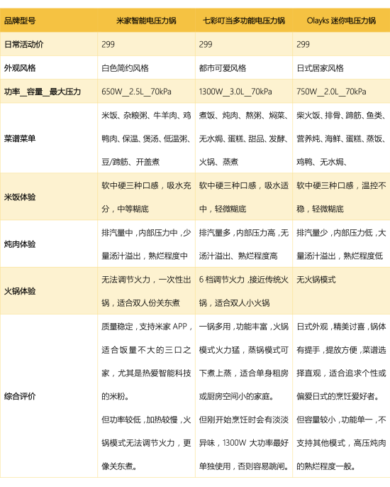 在价格差不多的前提下,谁不喜欢功能又多又好用的产品呢?下面就来看看小米米家电压力锅2.5L、七彩叮当多功能电压力锅、olayks迷你电压力锅,在使用体验和功能对比上的表现如何吧~