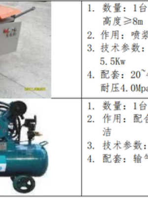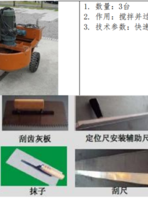 (3) 搅拌机、铁丝网、彩条布、空鼓锤、木砂板、托线板、2-3m 靠尺、托灰板、钢筋卡子、扫帚、钢丝刷及胶水管等。