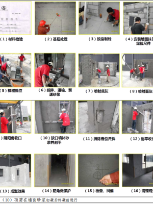 (5) 水泥砂浆不得抹在混合砂浆上,强度等级高的砂浆不应抹在比其强度低的砂浆层上。严禁用干水泥收干抹灰砂浆。抹灰层厚度最少不应小于 7mm。必须使用机械搅拌抹灰砂浆,禁止人工拌和抹灰砂浆。