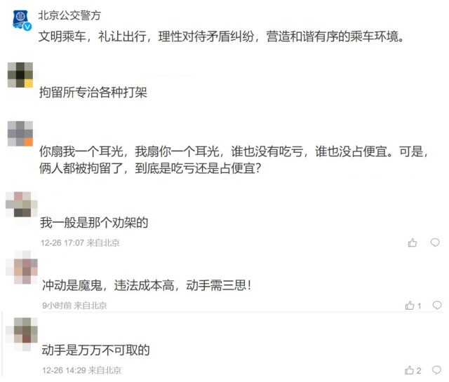 北京公交警方12月26日通报,孙某与杨某因下车时人多拥挤产生纠纷,在站台上发生肢体冲突。地铁工作人员及时制止,两人各自有不同程度的轻微伤。