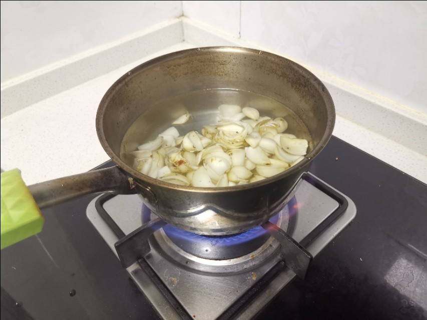 将鲜百合清洗干净,放入沸水中煮两到三分钟,去除苦涩味。