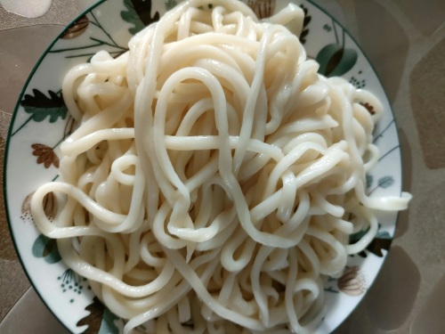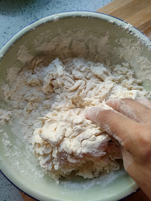 今天我给大家教做新疆家常拌面。拌面讲究和面,水里放少许盐,把面和成絮状,