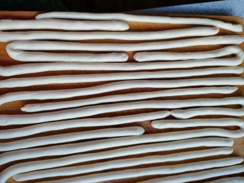 再揉搓成面团,盖着醒发半小时,利用这会切肉 、洗菜,面醒发好后再揉搓成条 ,抹上油码在案板上盖好。