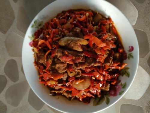 三塘湖的辣皮子肉厚微甜,配上皮芽子做拌面是一绝!热锅凉油把肉炒香 ,倒入姜、红辣子煸出香味,放入韭菜迅速翻炒,冬天韭菜不能炒时间长,放调料出锅。滚辣皮子先把肉炒出香味,放皮芽子、蒜爆炒出香味,放入辣皮子煸炒,再放佐料、蒜出锅。
