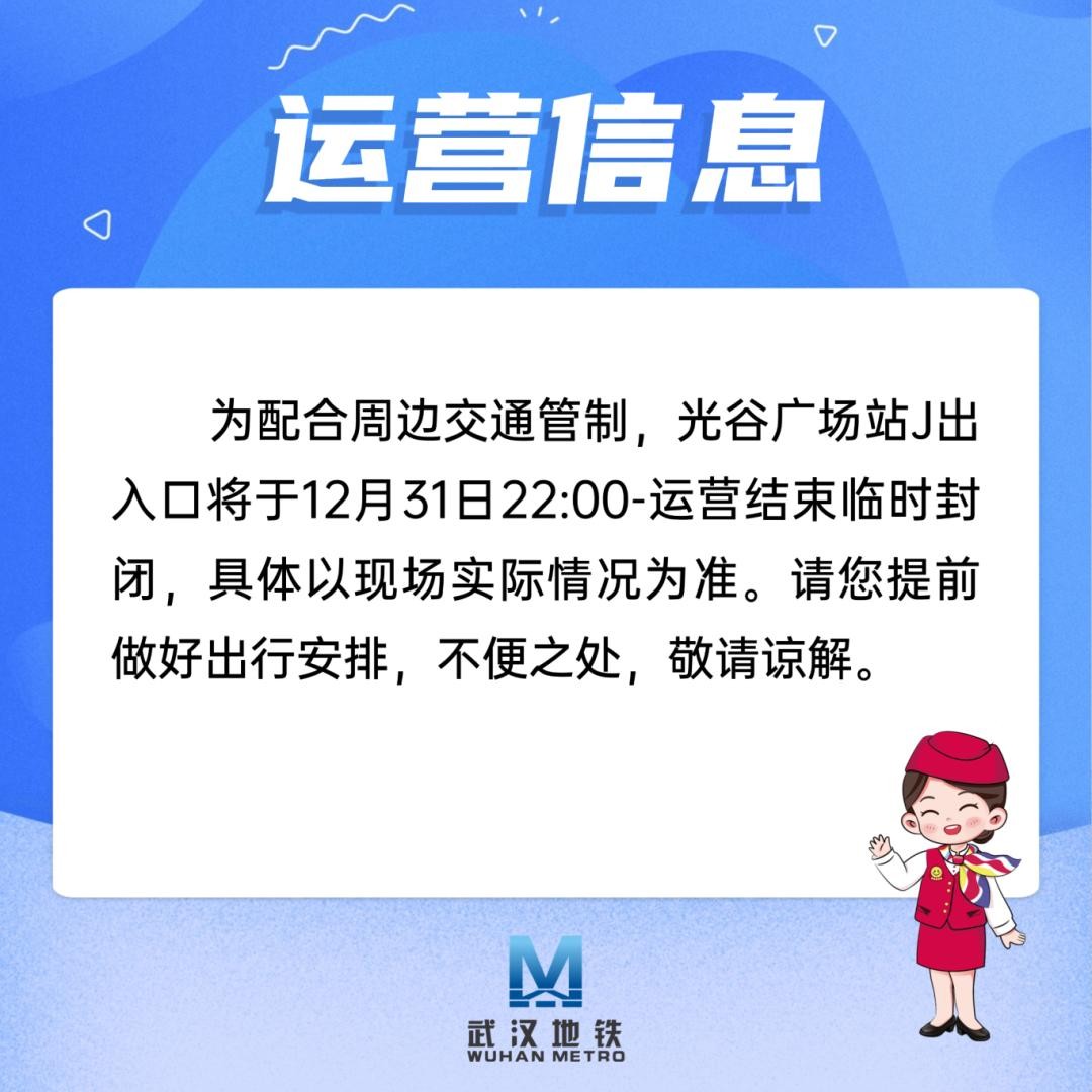 为配合周边交通管制,光谷广场站J出入口将于12月31日22:00—运营结束临时封闭,具体以现场实际情况为准。请您提前做好出行安排,不便之处,敬请谅解。