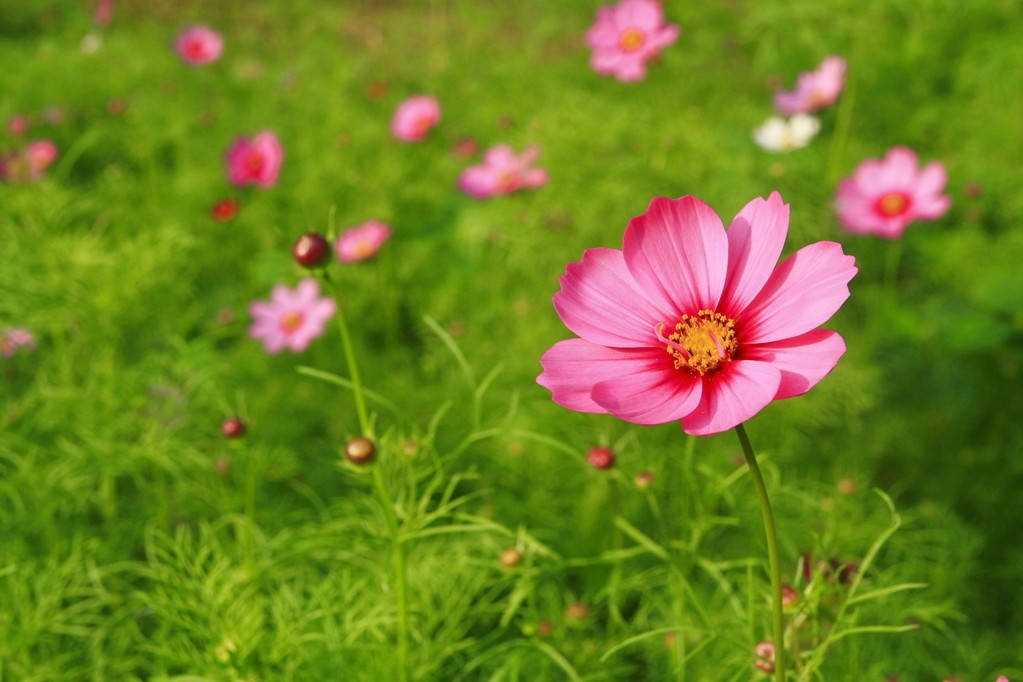 波斯菊,别名秋英,一年生或多年生草本,花期6-8月,果期9-10月,秋英生长于海拔可达2700米以下的路旁、田埂、溪岸等地。原分布于美洲墨西哥,在中国栽培甚广,云南、四川西部有大面积归化。全草可入药,具有清热解毒、明目化湿的功效。也可用于公园、花园、草地边缘、道路旁、小区旁的绿化栽植。