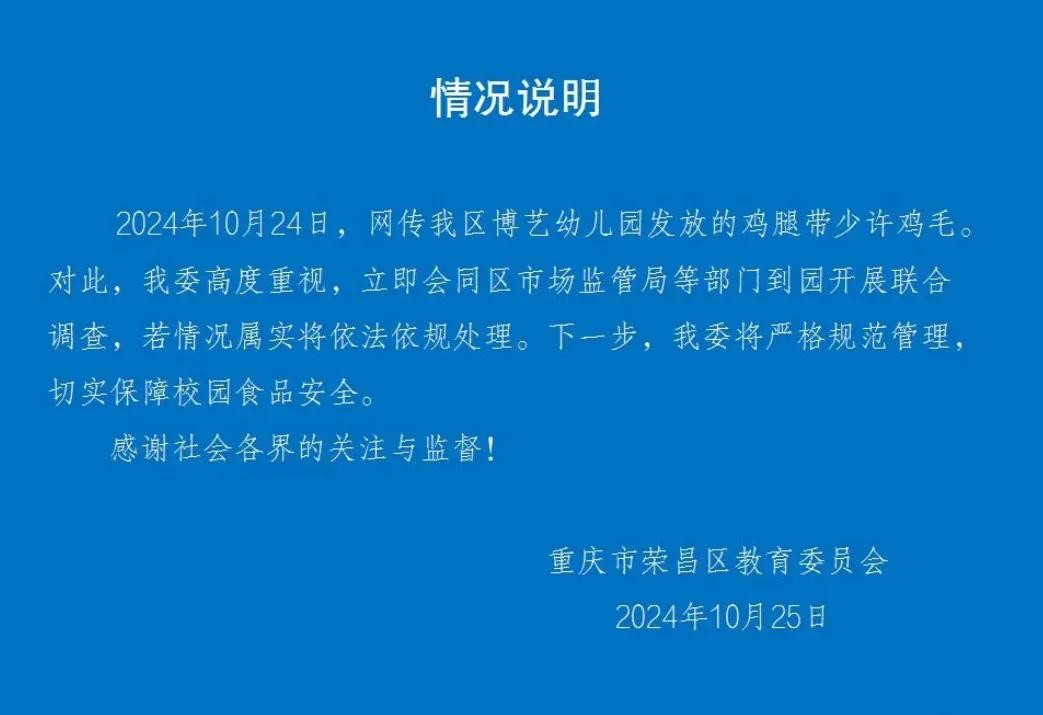 重庆市荣昌区教委表示,本区幼儿园发放的鸡腿带有少许鸡毛事件教委高度重视!已经会同相关部门展开联合调查!