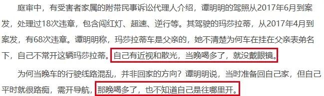而谭明明在庭审是怎么说的?她说自己有近视、散光,喝多了,自己也不知道要往哪里开!
