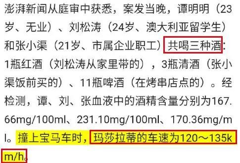 案发当晚,案发当晚,谭明明和她的朋友们共喝了3种酒,共15瓶。据谭明明说:7月3日,他们三个聚会,她是要当媒婆,准备撮合张小渠和刘松涛恋爱。撞车时的车速达到了120~135km/h。