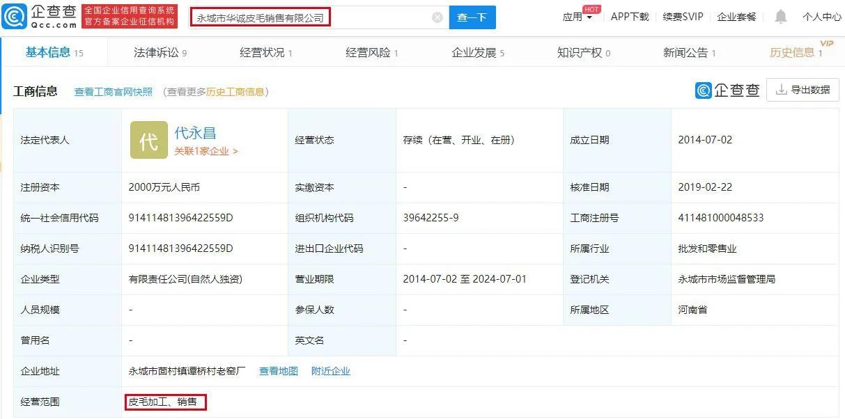 谭明明家成立的皮革厂叫永城市华诚皮毛销售有限公司。