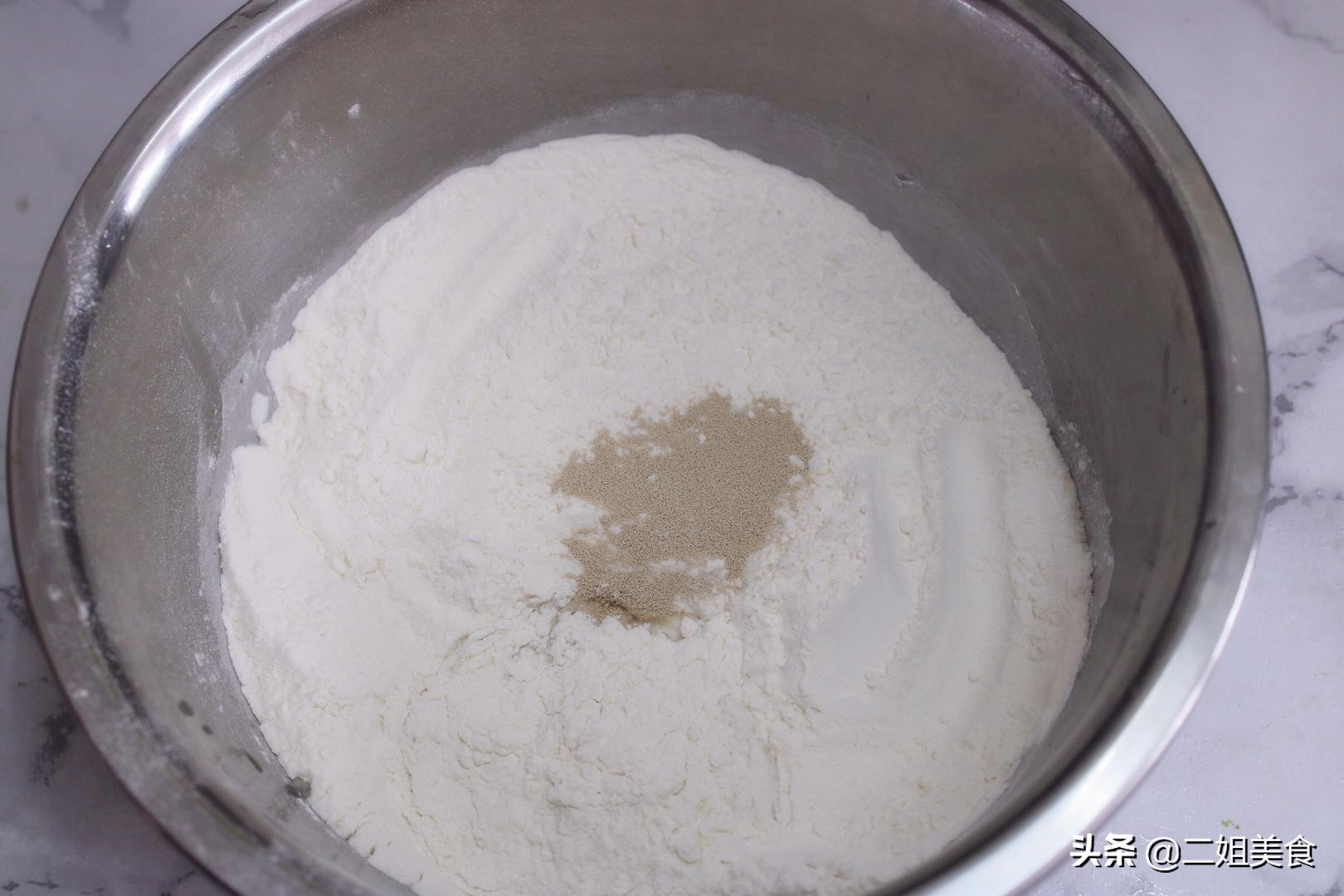 1、首先我们找一个大一点的面盆,随后放入250g面粉和3g的酵母粉。