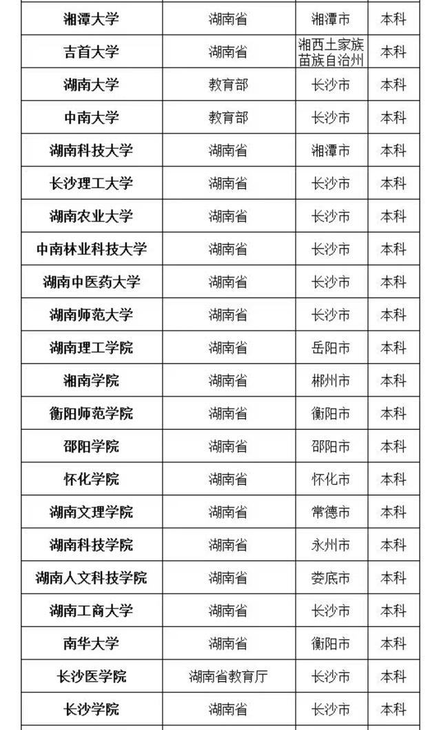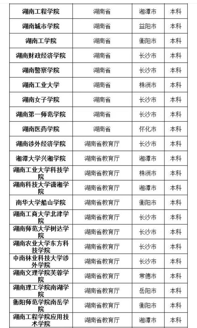 湖南省有高校125所,其中本科院校52所,专科院校73所。以下是教育部最新公布的湖南省本科院校名单(不包括国防科技大学)。从中可以看出湖南的民办本科院校、独立学院还是占了一定数量的。