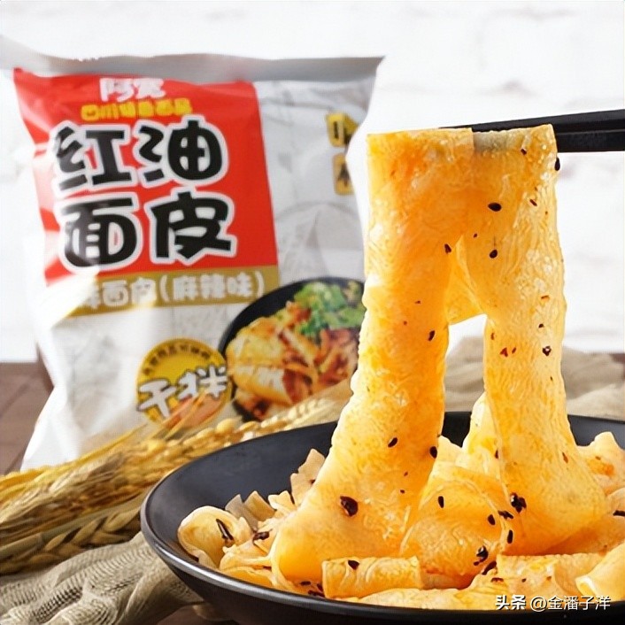 这款面像凉皮,凉凉滑滑的,最方便的是它不用煮,直接拌一拌就好吃的阿宽红油面皮。用开水冲泡5-6分钟后熟透,再用凉水一冲,面皮筋道Q弹,宽宽的面皮裹上红油料包和调味料包,香辣开胃,入口处舌头惊起一片辣香,炸开,在食道中久久回响。