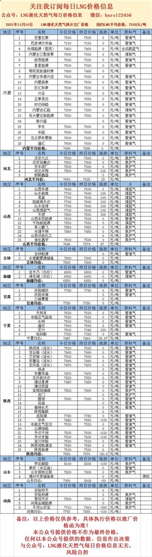 2021年11月16日全国LNG液化天然气价格 价格处于平稳阶段
