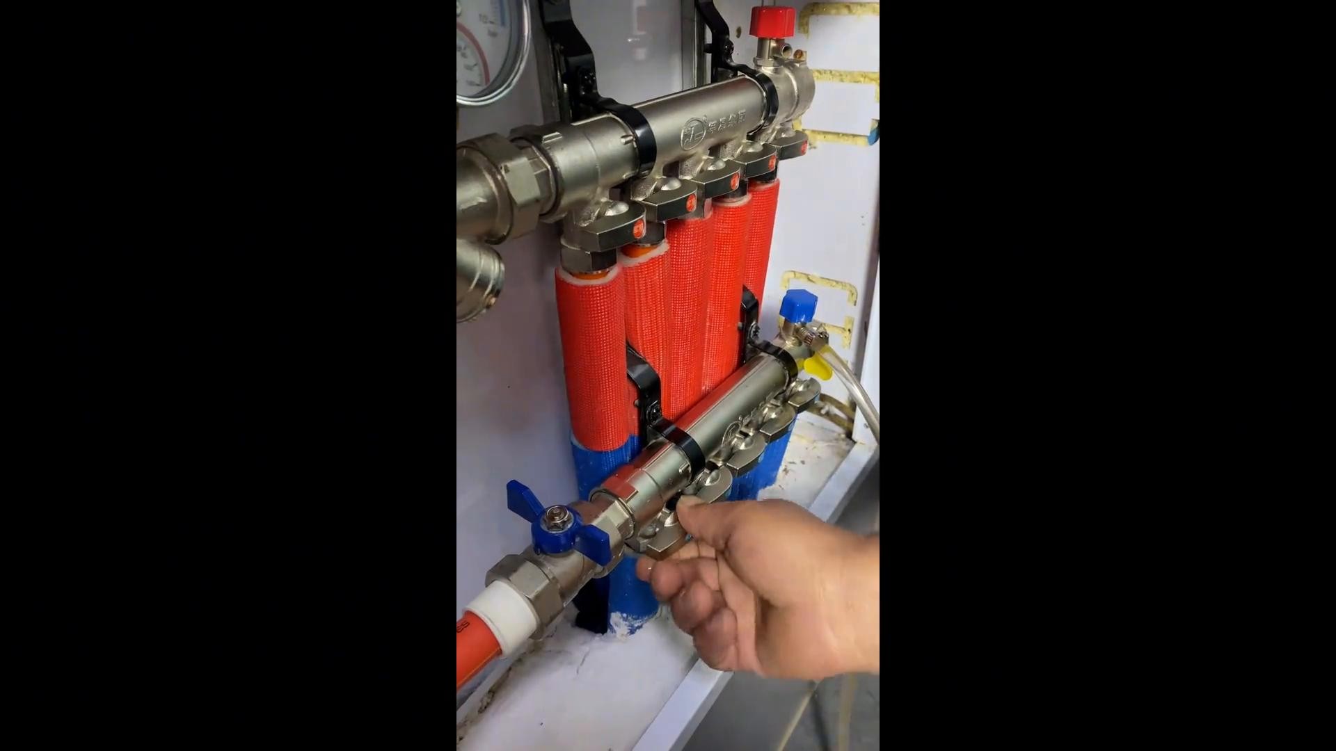 3. 将其装到回水管的排气阀上,开始放水,先放第一路,一上一下为一路,打开阀门,打开回水阀门。