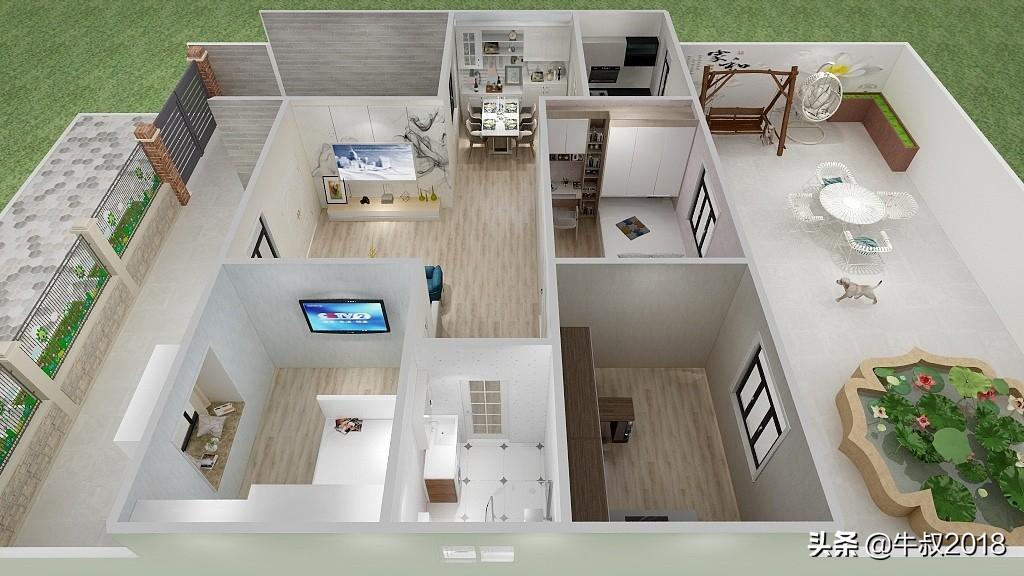 房屋共三室两厅一厨一卫,入门是会客厅,左手边餐厅厨房,厨房设置在后面,直通后院,封闭式的后院,可以在院子里养一养鱼,种一种花,是件很美好的事情。右手边三个卧室一间卫生间,布局十分紧凑,下面是一些效果图,仅供参考;