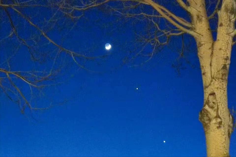 据2月22日晚北京天文馆观测到:当晚的金星伴月观测条件不错,木星的亮度约为负二等,金星的亮度约为负四等。在弯月的右边有一个明亮的星,这就是金星,形成金星伴蛾眉景观。夜空中第三亮的天体——木星,就在距离它们大约8度的上方,木星和金星两颗亮星一近一远“护航”在“月亮船”旁边,让这幅浪漫的画面更具观赏性。