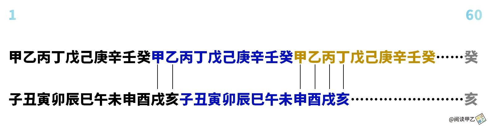 纪年的干支一共有60个,称为六十甲子(图1)。组合方法是十个天干和十二个地支依次两两相配,甲子、乙丑、丙寅······因为地支比天干多两个,所以地支剩下戌、亥,它俩连同新一轮的地支再和新一轮的天干相配,这次地支又剩下申、酉、戌、亥(图2)······就这样匹配下去,直到天干、地支刚好都是最后一位配成癸亥而结束,之后又回到甲子进行循环,周而复始,最终共配成了60个干支,所以称为六十甲子,六十年是一个纪年的循环周期。