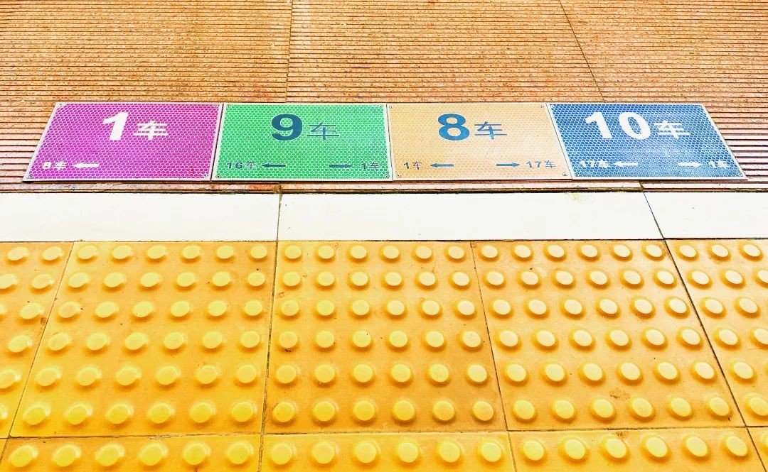 黄色:用于标识16节编组的正编列车车厢。如果乘坐的是长编组列车,那么根据黄色地标就能轻松找到自己的座位。